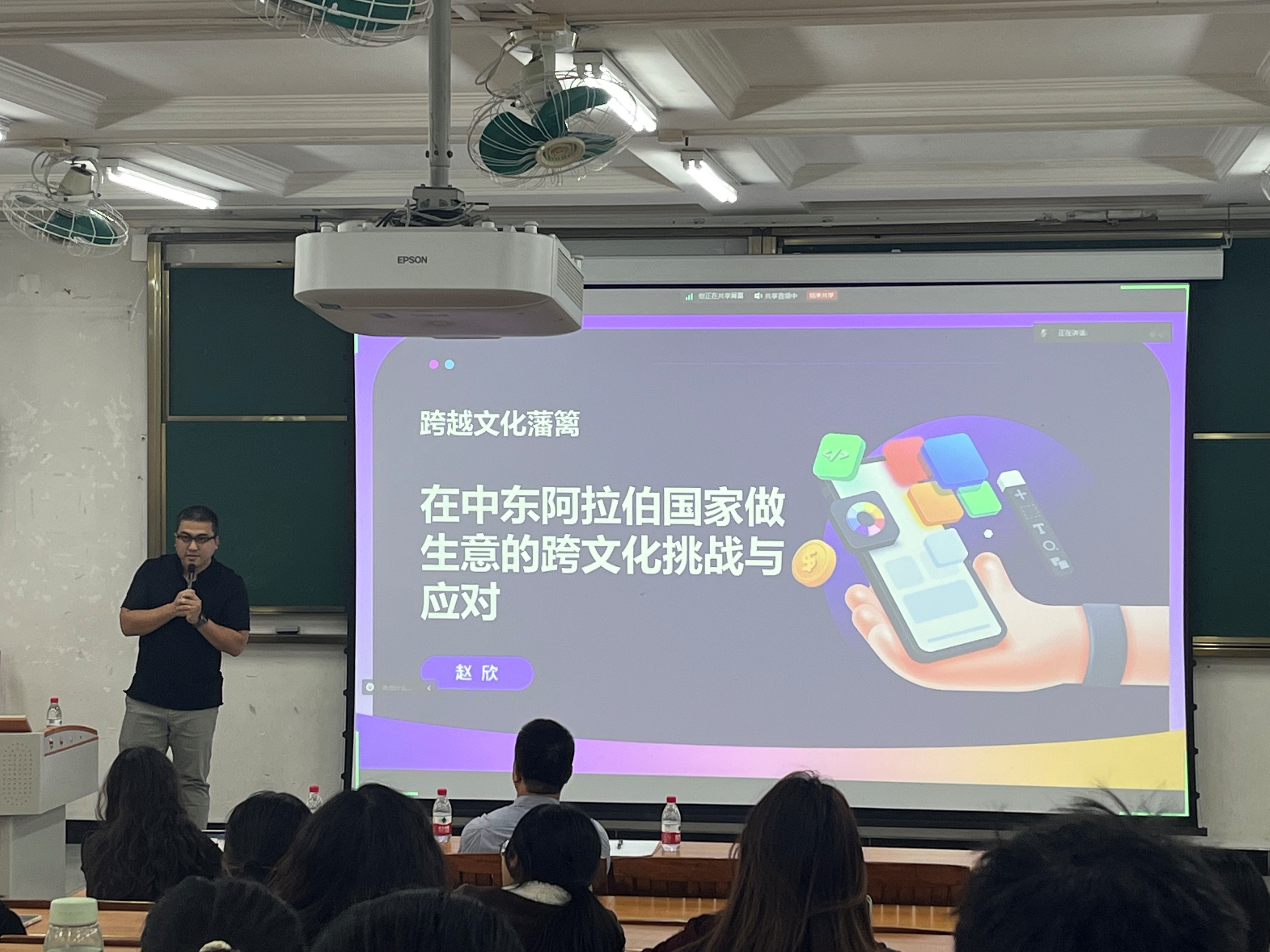 讲座过程中,赵欣先生以其深厚的专业知识和丰富的跨文化交流经验,首先对阿拉伯地区的地理和民族概念进行了系统梳理,使师生们对中东地区有了更清晰、全面的认知。他结合在中东地区的亲身经历,以风趣幽默的语言和生动详实的案例,直观地展现了中东阿拉伯国家独特的文化特点与魅力,让同学们深刻感受到了不同文化之间的差异。随后,赵欣先生分享了一系列实用的应对策略,如通过深入学习当地文化、主动探索文化趣事等方式武装自己的大脑,通过汇聚全球精英、组织文化盛宴等方式打造多元文化团队,通过学习当地语言、积累非语言信号等方式提升沟通技巧。此外,他强调诚信与尊重在跨文化交流中的重要性,可通过参加公益活动等方式融入当地社会,树立良好的企业形象。