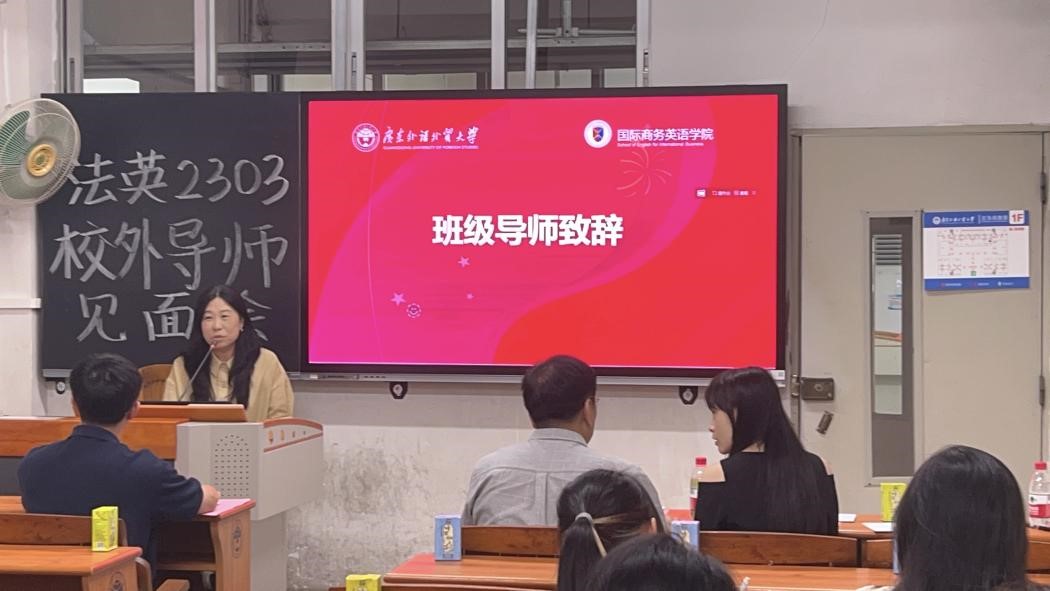 班长涂烷婷代表法英2303班同学欢迎校外导师的到来,并向校外导师介绍了班级概况,包括学生组成、课程学习等内容,进一步帮助校外导师了解了所带班级情况。