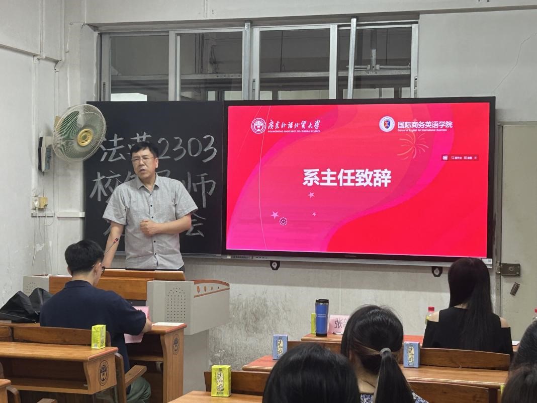 会议伊始,法律英语系主任张新红副教授首先代表法律英语系欢迎校外导师来到广外给同学们做分享,同时张老师从法律英语系的教学内容、就业方向等方面鼓励同学们勤于思考、多加实践,利用学校现有的资源,多向班级老师、校外导师学习取经,努力成为全面发展的涉外法治人才。