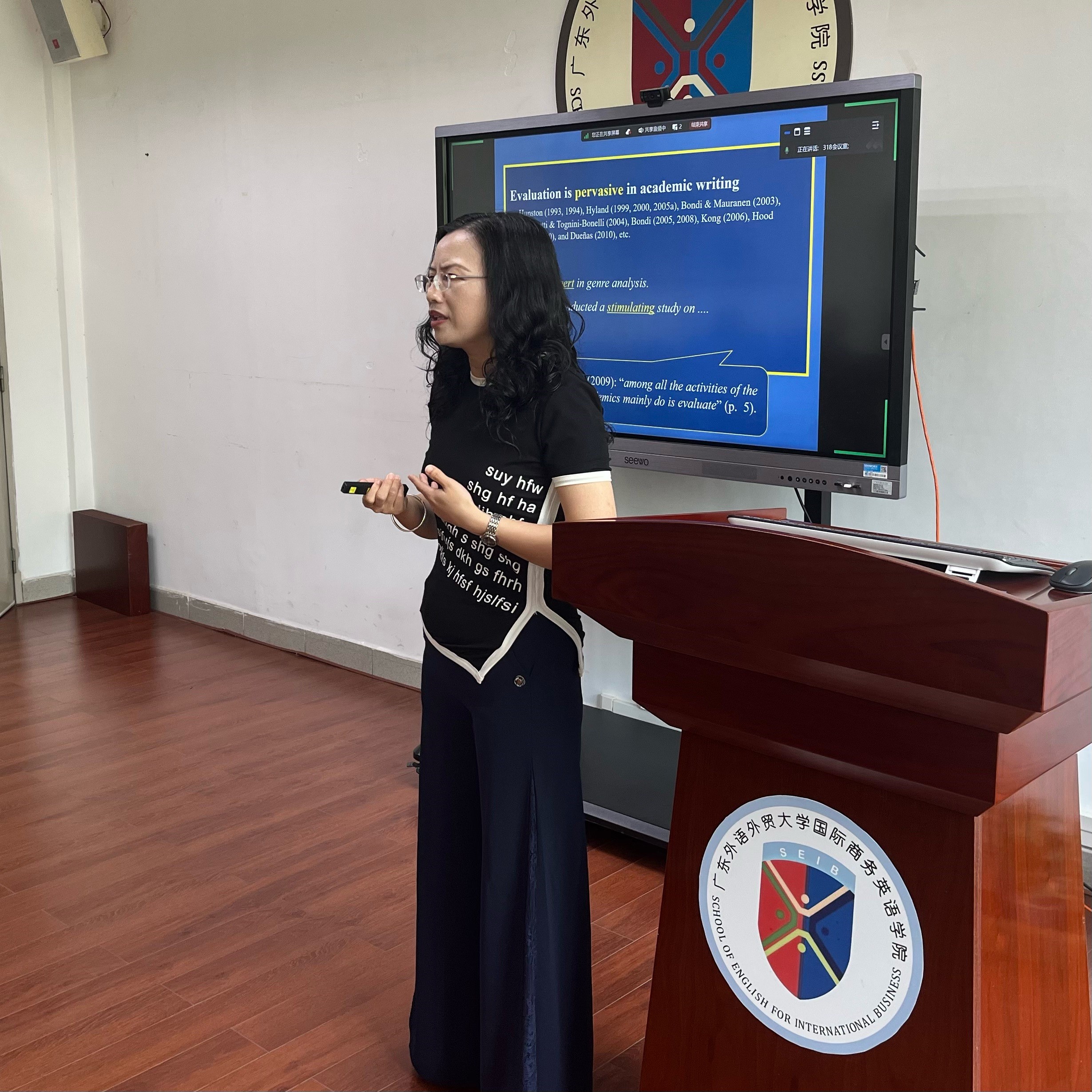永利官网商务英语教学创新团队牵头于2024年5月29日开展了本学期首次午间学术沙龙,线上和线下同时进行。本次沙龙邀请我校英语教育学院谢剑萍副教授为永利官网教师带来了题为“学术论文写作中的作者立场建构:研究与实践”的精彩讲座。此次讲座由许琪教授组织,王伟强副教授主持。汪谓超副院长和10多位教师线下出席,同步20多位师生在线参与聆听。