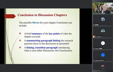12月22日14:30-16:30,我校云山讲座教授、澳大利亚悉尼大学Terry Royce教授在腾讯会议平台为yl6809永利官网的师生带来了系列讲座第四场,题为Moving Meanings in Economics and Business Academic Writing: the Literature Review, Methodology, Results & Discussion。讲座由何宇菲博士主持,yl6809永利官网法律英语系系主任张新红副教授、英语教学部系主任汪谓超副教授以及yl6809永利官网的部分教师、硕士生和博士生参加了本次讲座。