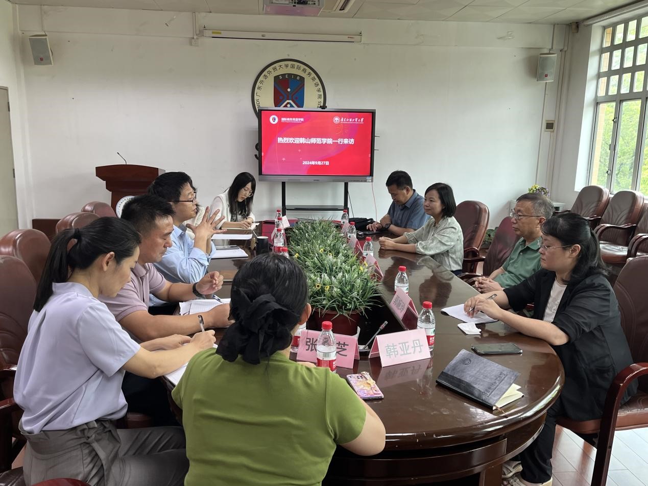 9月27日下午,韩山师范学院外语学院院长刘毅,副院长吴春明、陈幕侨,系主任郭婉玲一行来永利官网调研交流。yl6809永利官网院长胡春雨,副院长汪谓超、陈潇潇,系主任林洁、严小庆、何宇菲,副系主任张芸芝参加座谈。