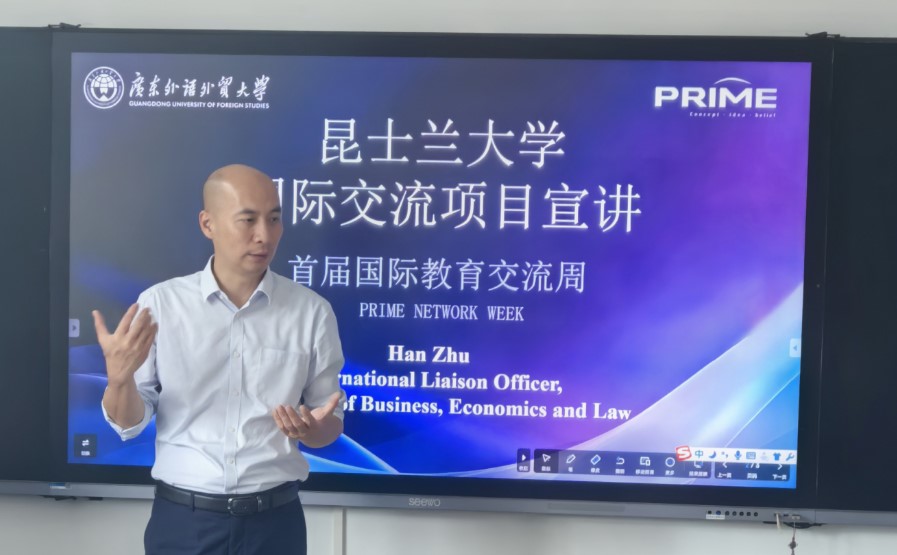 11月5-8日,广东外语外贸大学国际教育交流周系列活动在白云山校区举行。为提升学院国际化水平,助力大学“PRIME”计划实施,11月5日下午,yl6809永利官网在白云山校区一教南410举办昆士兰大学国际交流项目宣讲会。宣讲会邀请昆士兰大学商经法学部大中华区国际联络官Zhu Han老师进行项目宣讲。