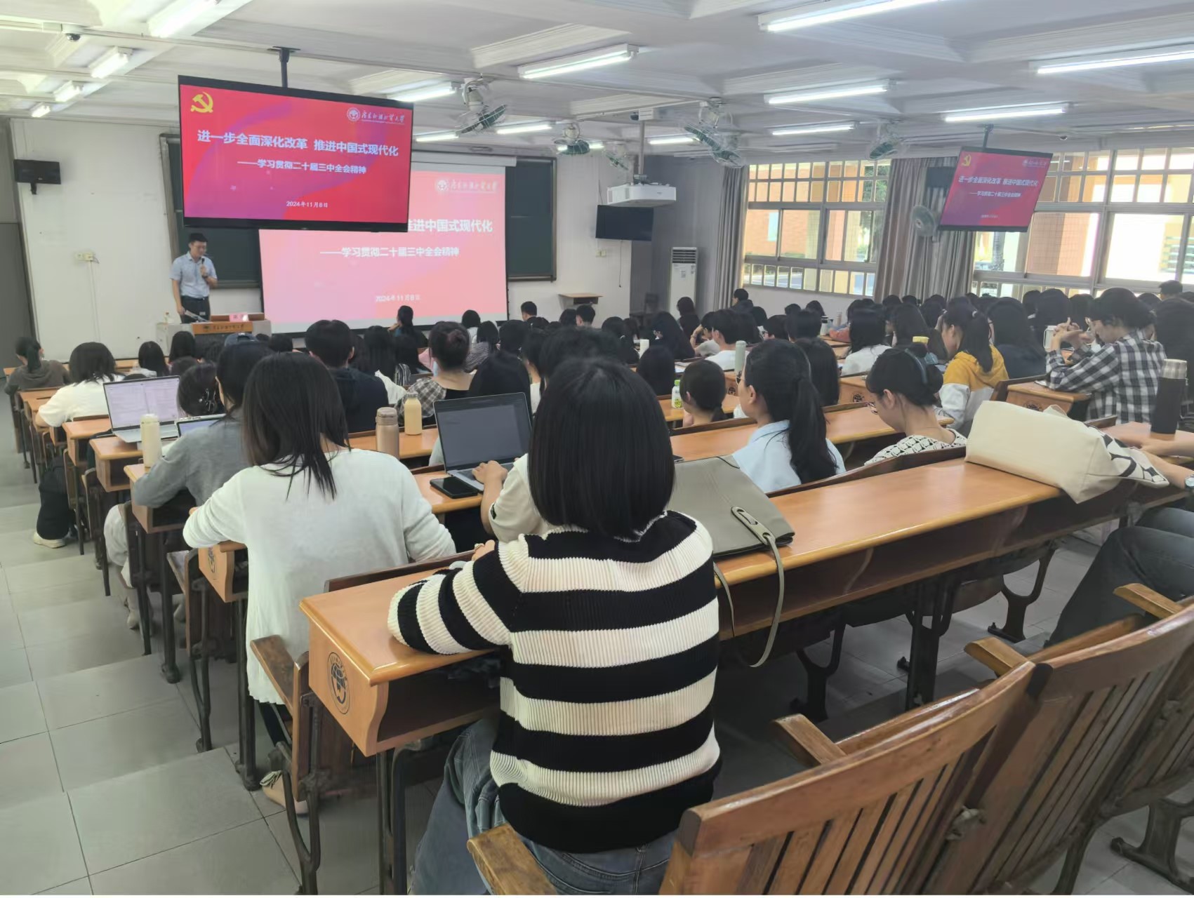 根据大学党委统一部署,11月8日下午,yl6809永利官网党委在白云山校区二教116召开学习贯彻党的二十届三中全会精神宣讲会。宣讲会由学院党委书记苏冬燕主持,特邀马克思主义学院副教授、校级宣讲团成员洪汛老师主讲。院领导、各系部办主任、行政人员、辅导员、教工党员代表、学生党员以及入党积极分子等140余人参加会议。