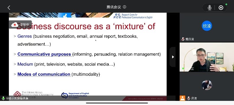 2024年12月5日到6日,广东外语外贸大学国际交流合作部主办,yl6809永利官网承办的海外名师项目《多模态语篇分析与翻译研究》第五讲至第六讲成功举办。项目主讲人为香港理工大学英文与传意学系副教授、博士生导师冯德正老师。该讲座由本项目负责人吕洁副教授主持,商英、高翻和英文学院多名教师、研究生和访问学者聆听了本系列讲座。