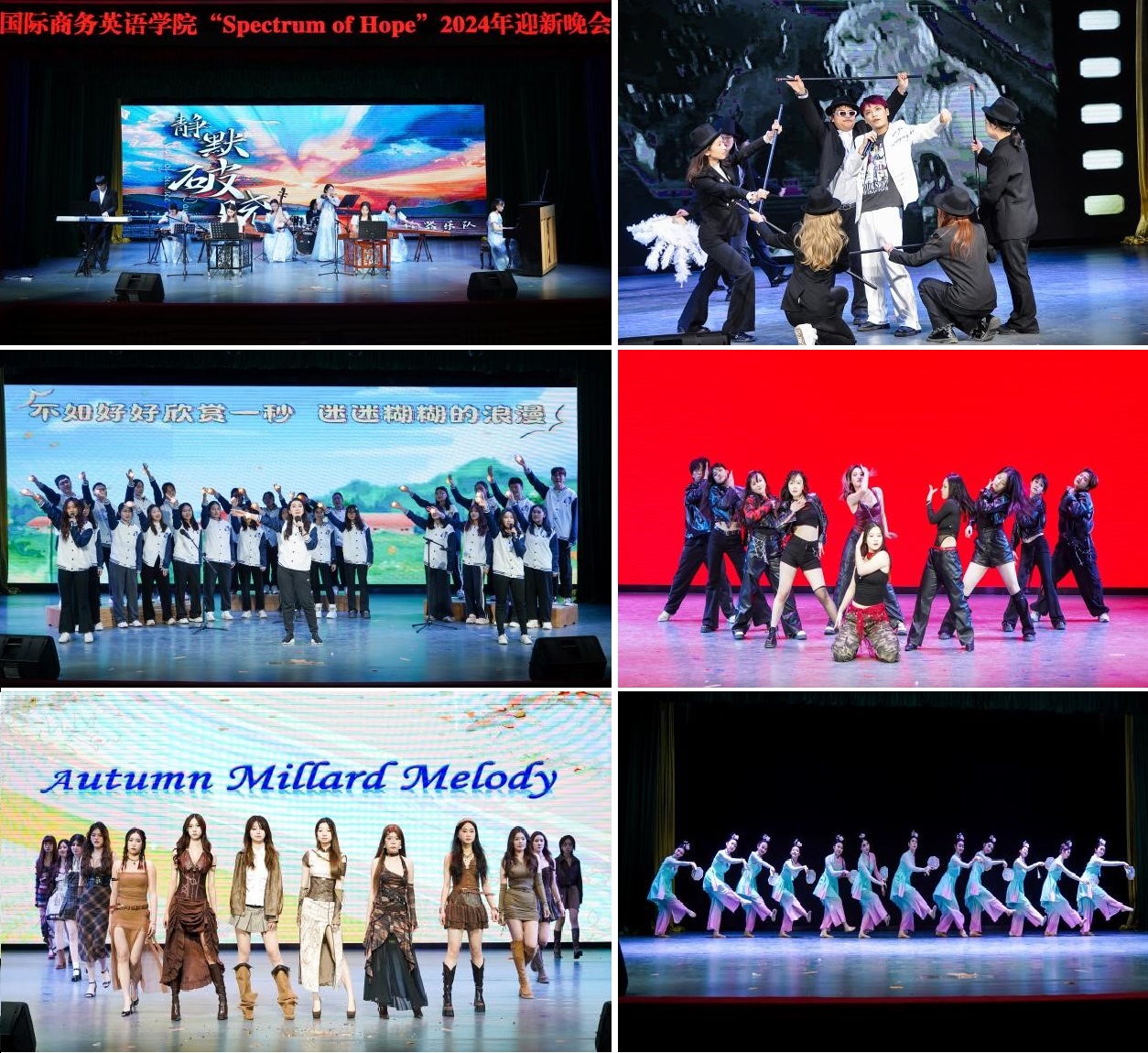 由校器乐队倾情呈现的精彩演奏《静默破晓》,正式拉开了本场晚会的序幕,将中西方乐器完美融合,旋律悠扬,令人陶醉,为晚会奠定了独特而动人的基调;学生组队《I Can Do It With A Broken Heart》,重现了著名歌手Taylor Swift时代巡演的名场面,赢得现场观众阵阵掌声;校舞队则带来如诗如画的古典舞表演《淡妆浓抹总相宜》,轻盈的舞步和曼妙的身姿带我们重温了江南那柔情似水的天堂;接下来的节目是法双1班班主任石静教授与同学们携手共唱《小美满》,他们的歌声饱含深情,充分展现了春风化雨般的师生情谊;商英舞队则以一曲《It’s ok I’m okay》的舞蹈表演,演绎热烈与优雅并存的青春。随后学院礼仪模特队闪亮登场带来精彩绝伦的走秀表演《Autumn Millard Melody》,再现了美拉德风格。
