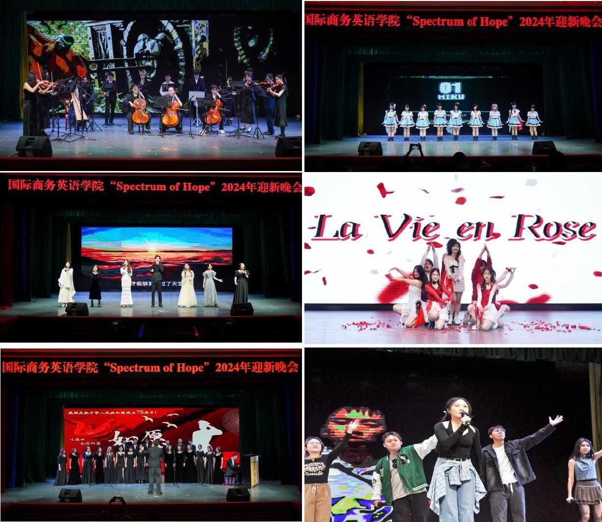 校管弦乐队演绎的《加勒比海盗》震撼人心,弦乐激昂澎湃,管乐嘹亮高亢,伴随着震撼的打击乐,精准地重现了原曲中的磅礴气势与冒险精神;动漫协会带来充满活力的《探索未来》舞蹈表演,让我们穿梭于二次元的世界;商英院歌队的歌唱表演《青春佳期,梦启初心》,用歌声告诉我们在追梦路上,不忘初心,方得始终;校合唱团用歌曲《如愿》深情歌颂了伟大中华人民共和国成立75周年以来的辉煌成就,展现了商英学子对祖国的热爱与祝福;学生组队带来的舞蹈表演《La Vie en rose》,身姿轻盈,动作流畅,将优雅与浪漫完美融合,带我们徜徉在玫瑰的花海当中;绿洲音乐协会则带来的rap表演《High Fire》更是嗨翻全场,以独特的音乐风格和青春活力展现了年轻人的无限可能。