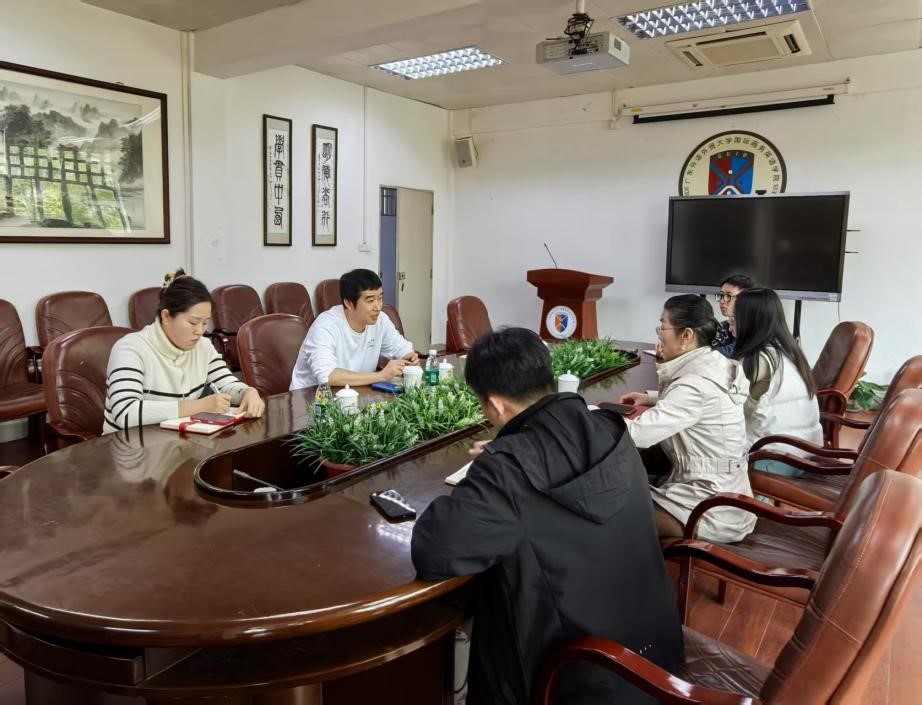 杜焕君对商杰强的到访表示热烈欢迎,并系统介绍了学院学生工作整体情况。在队伍建设方面,重点阐释了辅导员队伍专业分工体系,每位成员在负责对应年级学生管理的同时,分别牵头党建、团学等专项工作模块,并且每个模块都有亮点打造目标。谈及特色育人品牌,杜焕君详细阐述了学院“专业+实践”双融双促的育人模式,着重介绍了全国英语商务实践大赛、博物馆双语讲解大赛等具有学科特色的品牌项目,形成“以赛促学、赛教融合”的实践育人新模式。