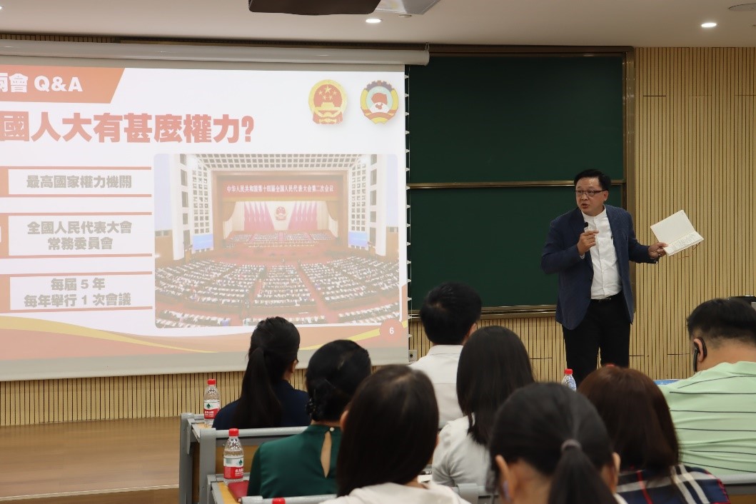 在专题学习会上,何君尧深入解读了两会制度,系统阐述了全国人民代表大会和中国人民政治协商会议作为中国特色社会主义民主政治的重要实践以及每年3月召开的重要意义。他指出,人大代表通过提案反映民意,政协委员则履行政治协商、参政议政职能,二者共同推动国家治理现代化。何君尧还详细阐释了国家治理架构中的“五套班子”在党的领导下协同运作的机制。他强调:“党统筹全局,人大依法监督,政协集智献策,这种制度设计确保了国家政治安全与发展方向的统一。”