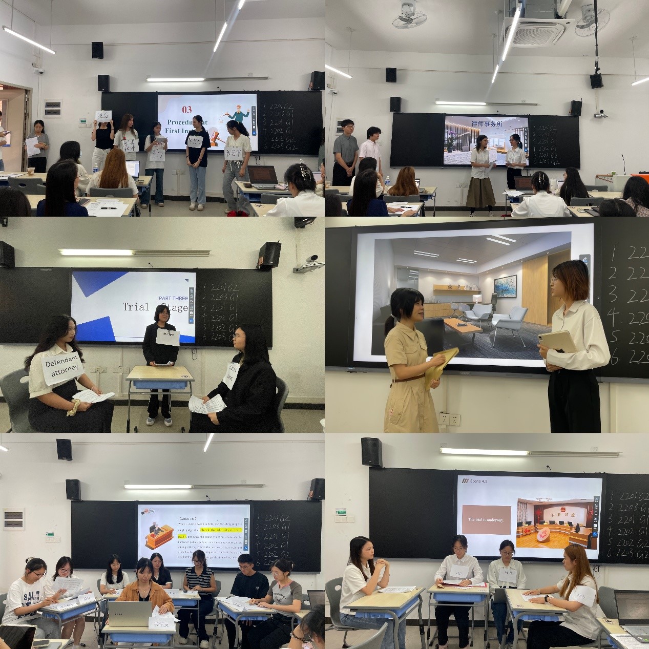 进入赛中环节,六个小组围绕《中华人民共和国民事诉讼法》(The Civil Procedure Law of the People’s Republic of China),各展所长,采用多种创意形式进行展示。有的组通过情景模拟再现法庭中的真实场景予以展示;有的组通过扮演年轻律师请教行业前辈,展现律师在进行法律翻译时所遇的难题;更有小组结合典型案例,条分缕析地梳理诉讼全流程,将抽象法律条文转化为具象知识。其中2203班第一组另辟蹊径,以幽默诙谐的短剧形式,扮演年轻律师向行业前辈请教,在轻松的对话中巧妙展现出法律翻译过程中遇到的诸多难题,引得现场观众笑声与掌声不断;2202班第二组则紧扣“离婚诉讼”主线,从案件受理、举证质证到法庭辩论,以情景化讲解层层递进,完整串联诉讼全流程,尤其是在法庭辩论阶段,控辩双方化身专业律师,援引法条据理力争,当事人声情并茂的陈述与双方律师之间针锋相对的辩论,既还原了司法实践的真实场景,更通过对法律程序与逻辑关系的深度剖析,彰显出深厚的专业功底与缜密的思辨能力。