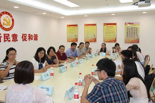 为了深入推进yl6809永利官网党建工作坊项目,在学院内营造更具有活力的党组织生活氛围,2014年6月6日下午,商英党建工作坊交流会在广外北校云山A座党代表工作室举行。校机关党委书记王秀民,特聘组织员黎燕,yl6809永利官网党委书记车小真、副书记张林茂,组织部党校办公室主任王迪,以及yl6809永利官网党员师生代表参加了本次座谈会。座谈会由张林茂主持。