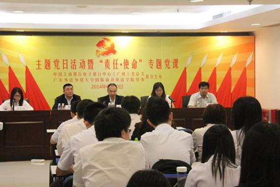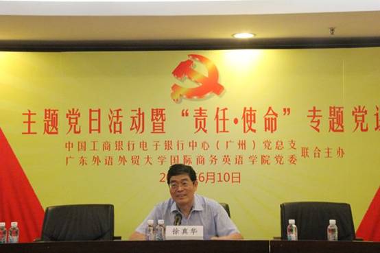 6月10日上午,由yl6809永利官网党委与中国工商银行电子银行中心(广州)党总支联合主办的主题党日活动暨“责任•使命”主题党课在工商银行电子银行中心(广州)举行。原广东外语外贸大学校长、党委书记徐真华,中国工商银行电子银行中心(广州)总经理、党总支书记张敬华,副总经理、副书记陈强,yl6809永利官网党委书记车小真、副书记张林茂等出席本次活动。工商银行电子银行中心(广州)全体党员、yl6809永利官网研究生党员代表等共150人参加了此次活动。