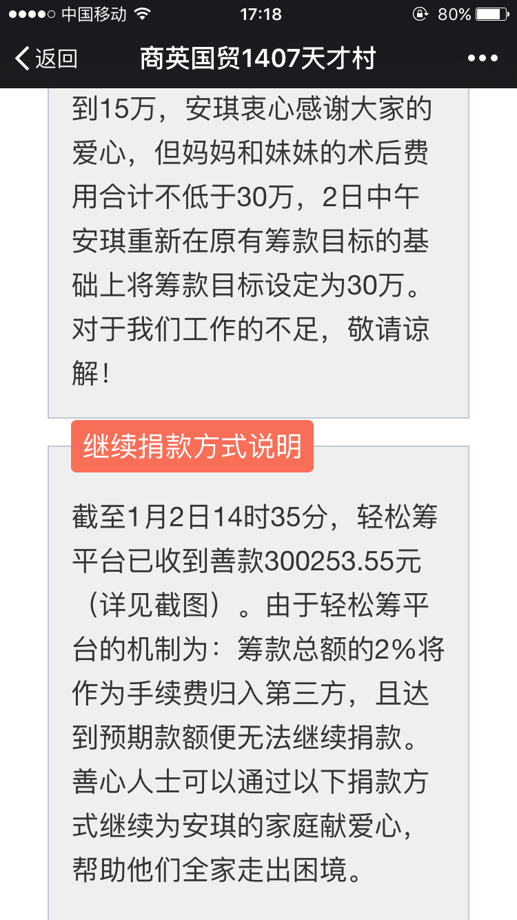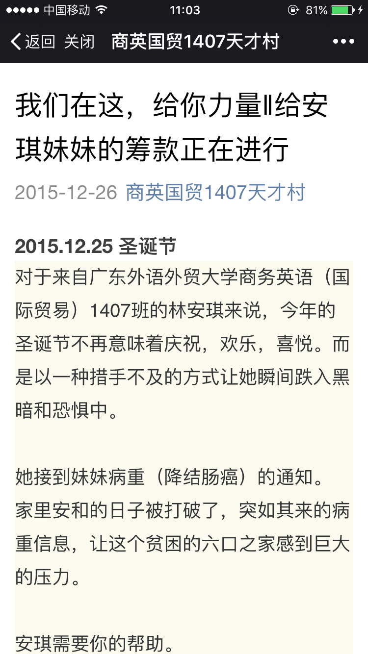 林安琪是我校国际商务英语大二学生,家庭贫困,靠国家助学金缴纳学费。她成绩优秀,多次获得校级奖学金,对未来充满憧憬与希望。25日,正在读高三的妹妹被确诊为降结肠癌,预计14万的医疗费一下来把她拉入了黑暗的深渊。危难时刻,班委选择站出来,连夜写作了推文《我们在这,给你力量‖给安琪妹妹的筹款正在进行》,在班级的微信公众号“商英国贸1407天才村”发出,呼吁筹款。该推文在我校师生微信朋友圈中得到大量转发。在我校师生及社会各界的支持下,截至27号23点30分,收到的善款总额达到186676.24元,“安琪妹妹的预期手术费已经基本筹齐,谢谢大家!现正式停止募捐,请周知。希望大家将爱心传递,把善款留给更需要帮助的人!”林安琪所在班级通过微信公众号“商英国贸1407天才村”发布推文呼吁筹款,短短两日,林安琪妹妹的预期手术费便筹集完毕。