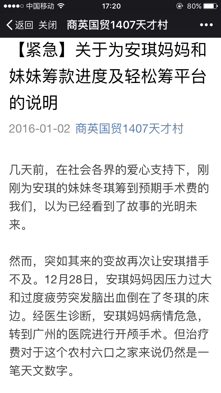 本以为风雨之后迎来阳光,然而,暴雨再一次降临在这个并不富裕的农村家庭。28日,安琪妈妈因压力太大和过度疲劳突发脑出血倒在了妹妹的病床边,转至解放军第421医院ICU病房抢救。新年伊始,本该合家团聚其乐融融,而事实却是一家人分隔两所医院,守着两个与病魔搏斗的亲人。面对措手不及的突发情况,班级微信公众号再次紧急发布推文,并利用众筹平台进行第二次募捐。截至1月2日14时35分,众筹平台已收到校友及社会各界爱心人士善款300253.55元。“病魔是无情的,我也许不够强大,但我不想也不会放弃。”安琪在此前班级发布的推文中如是说。
