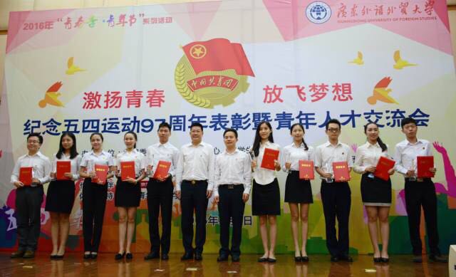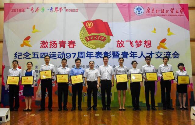 5月4日下午,纪念五四运动97周年表彰暨青年人才交流会在南校区顺利召开。广东外语外贸大学校长仲伟合、团省委副书记梁均达、建设银行广东省分行副行长王燊、广东外语外贸大学副校长刘海春、团市委副书记叶兴仁、京东集团华南区副总经理康亮等出席了活动。