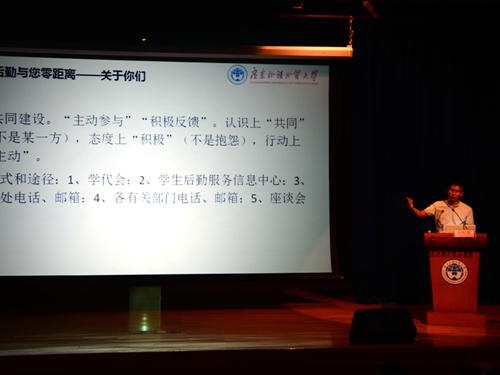 后勤处汤程荣做了关于后勤服务的专题报告。他以站在学校师生后、服务教学科研后和勤劳、勤奋向学生,解释了“后”与“勤”的含义,并系统的介绍了学校后勤的组成与服务提供方式。汤程荣在报告中指出了学生与后勤的紧密联系,也代表后勤处为学生提供良好服务做出了承诺,同时他也希望学生对学校后勤多一些理解与包容,更多的以主人翁精神参与学校后勤的发展与完善。