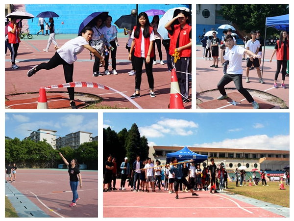 同时,跳远、铅球和标枪等项目也正在进行,助跑、起跳、腾空、落地,跳远动作看似简单,却都十分考验选手们的专注和技巧,一不小心就会踩线犯规。然而,商英学子们自信的笑容,专注的神情正在展示着真正的商英实力。