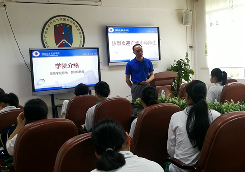 郭桂杭院长代表商英全体师生对广州中学师生参观广外和商英表示热烈欢迎,简要介绍了广外的基本情况和国际化特色,并着重向广州中学师生介绍了yl6809永利官网的专业特色、师资队伍、人才培养和近年招生情况,并现场回答了同学的提问。