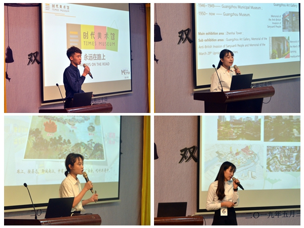在“我是代言人”的比拼中,八名选手各自为自己中意的一间博物馆进行中英文解说。本是博物馆志愿讲解员的姚婧怡用自然流畅的语音,不紧不慢的语速,轻松自在的状态娓娓道来广州博物馆的发展历史。介绍广州大剧院的邓萃婷和赵一霏不约而同都从剧院的建筑着手,前者神情自信从容,语调抑扬顿挫,自如地运用肢体语言给现场的老师同学阐释广州大剧院的魅力:不仅在于“大”,更在于“剧”,后者生动地将建筑外观比作两块石头的对话,深情回忆了其前世今生。为广州时代美术馆代言的三位选手各具特色:陈成寓不慌不忙,彬彬有礼地带领大家由上到下、由外及里探索这所奇妙的T型建筑;陈日晖善于与观众互动,他从独特的角度切入,流利的表达引人入胜;樊思捷则以第一人称讲故事的形式引出时代美术馆。来自歌队的蔡宁蔚对粤剧博物馆的建馆背景、地理位置、场馆设置及独特之处等方面做了简单的介绍。倪嘉选择烤乳猪为引子,别出心裁地介绍了陈家祠相关的宗祠历史及其寓意。