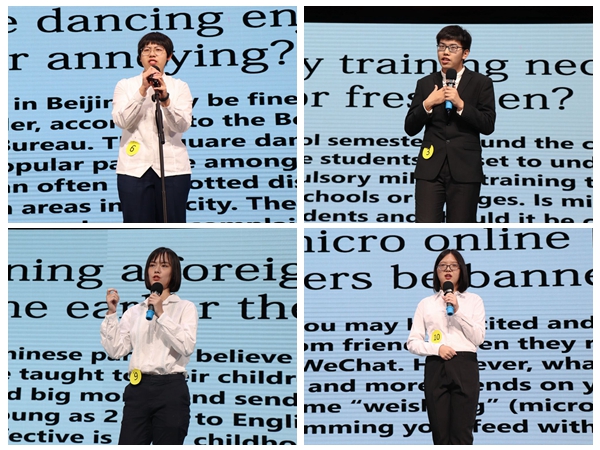 即兴演讲是比赛的另一大看点,晋级的八名选手重回舞台发表新一轮的演讲。演讲题目紧贴时事和生活,牢牢抓住了观众们的目光和好奇心。对于“广场舞是一种享受还是一种困扰”的问题,六号选手朱安贤一语中的,指出广场舞的三大痛处:时间地点音量,她饱满的发音、自然的语调再次引得掌声如潮。各位选手在这个环节都表现出了极强的语言表达能力与随机应变能力。