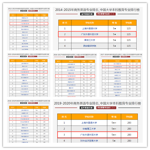 自2012年有公布排名以来,参评院校数量从最初的32所到高峰期的382所,广东外语外贸大学商务英语专业排名一直稳居前五,且等级已从4星提升到5星+,展现出永利官网商务英语专业力压群雄的绝对实力。