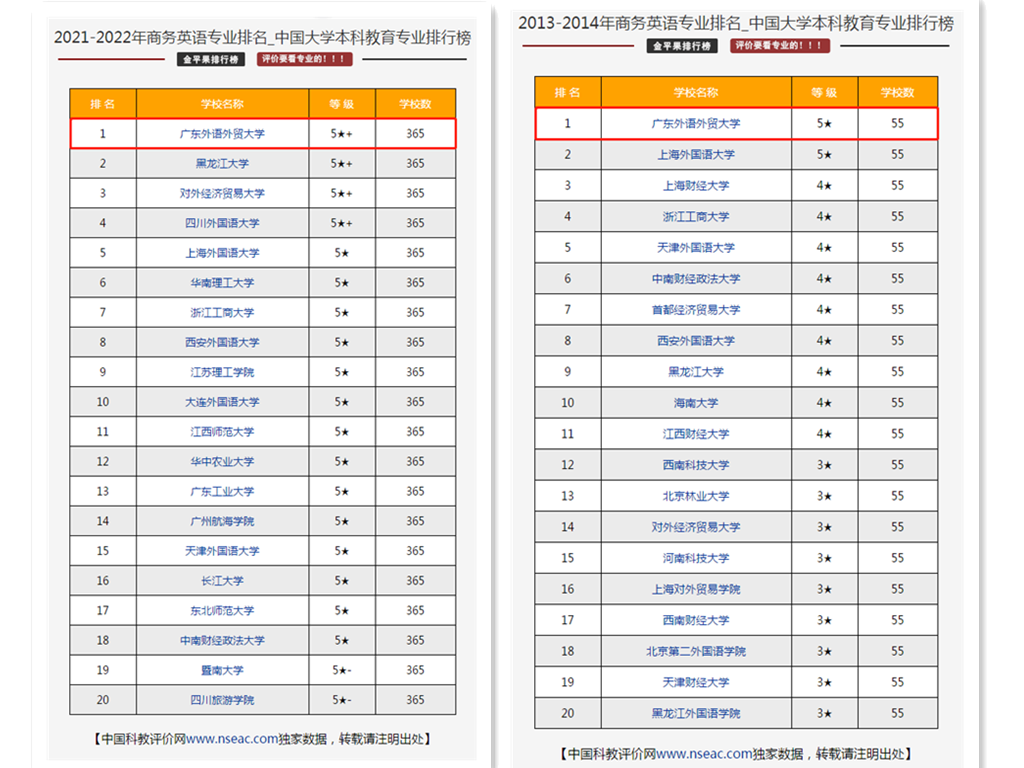 据金苹果中国科教评价网最新发布的消息,在2021-2022年中国大学本科教育商务英语专业排行榜上,广东外语外贸大学商务英语专业再登榜首,首次位居榜首为2013—2014年。
