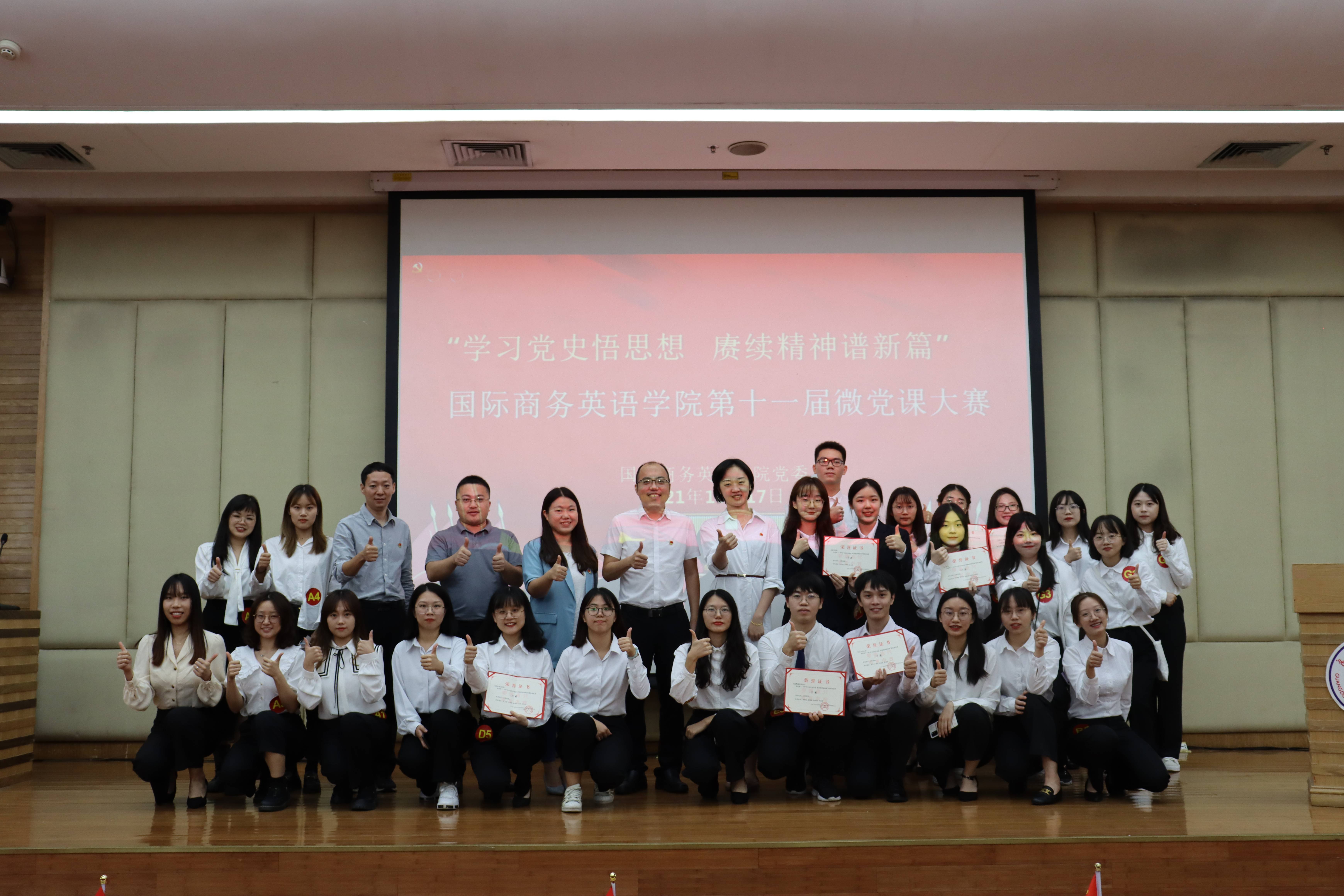 为学习贯彻习近平总书记在庆祝中国共产党成立100周年大会上的重要讲话精神,进一步在学生群体中弘扬“坚持真理、坚守理想,践行初心、担当使命,不怕牺牲、英勇斗争,对党忠诚、不负人民”的伟大建党精神。yl6809永利官网于2021年10月17日晚在图书馆报告厅举办“学习党史悟思想,赓续精神谱新章”第十一届微党课大赛。本届微党课大赛共计三十七支队伍进行报名,经过层层选拔的七支参赛队伍进入决赛同场竞技,为学院百余名学生讲解伟大建党精神。学院党委副书记陈静、校马克思主义学院陈娓老师、校团委陈琳琳老师、发展规划处莫小俊老师、辅导员魏煊以及学院百余名学生参加了本次比赛。