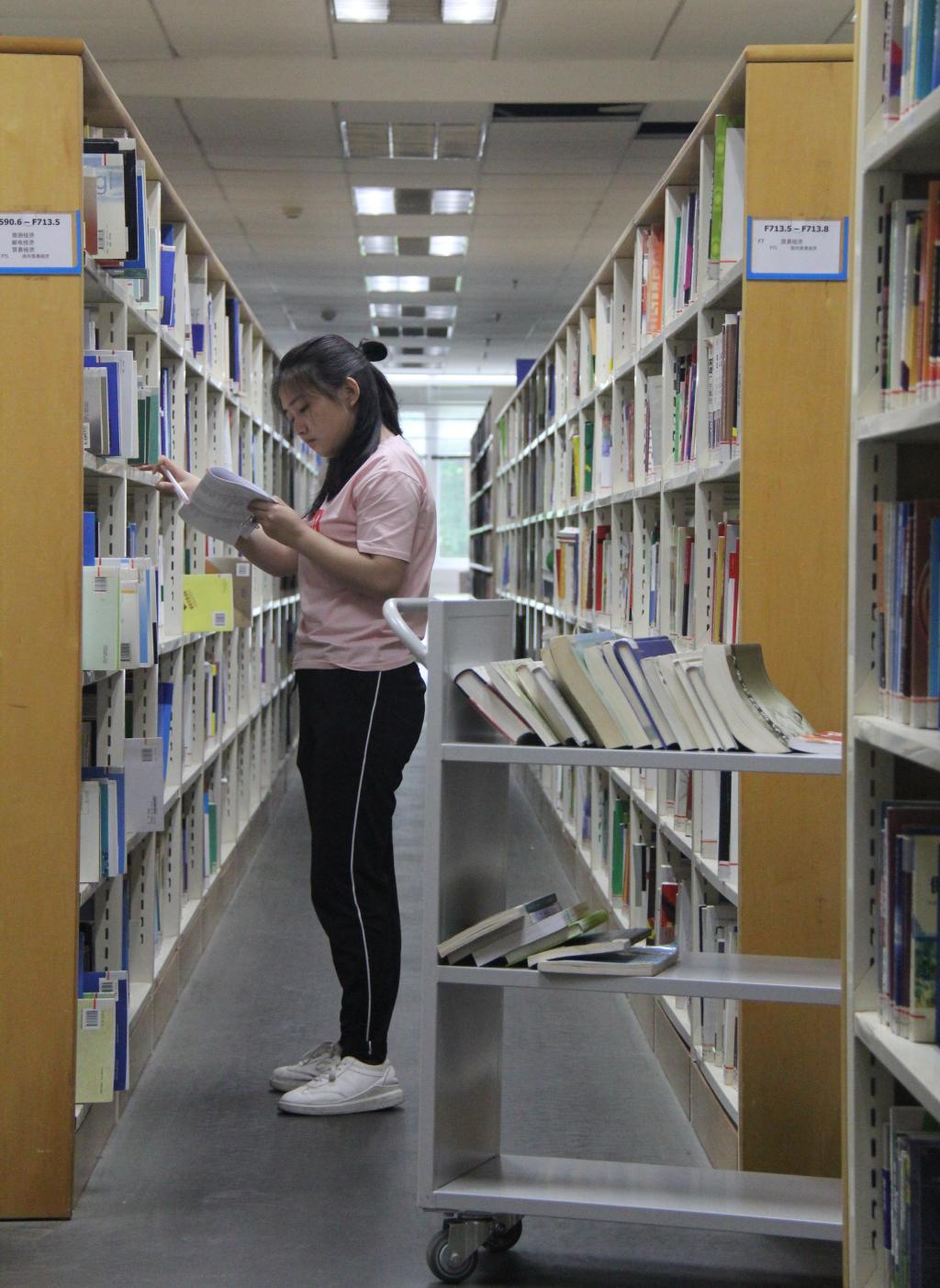 蹲下,起立,弯腰,踮起脚尖……构图,对焦,按下快门,志愿者们认真工作的佳影被跟拍人员默默地一一拍下。图书馆的志愿工作虽然看似枯燥单一,其实也需要考验志愿者们的能力与毅力。我们采访一位正在工作的志愿者,她停下手边的活,愉快地擦着额头上的汗说:“我很喜欢这种在书籍中漫游的感觉。”的确,不少做过志愿者的同学们都表示,这是一个让大家去熟悉、深入了解图书馆的极佳机会,在这过程中学习图书馆的各种管理模式,熟悉各类书籍的分区,甚至可以和书籍进行一场心与心的沟通。
