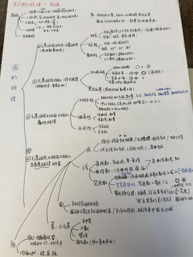 关于行测的技巧呢,可以总结为一句话:“抓大放小,学会取舍。因为是120分钟做135道题,优先拿下言语理解、判断推理、资料分析三大模块,常识和数量关系适当舍弃。我建议的做题顺序,是先做常识题,它可以活跃一下我的脑子(大概15-20秒/题),再做资料分析,这样也可以避免后期太疲惫影响定位,接着再是言语理解和判断推理,最后蒙一下数量关系并尽可能地验算重新做一遍。同时在备考中,无论哪个模块和题型,大量的练习是必不可少的!比如资料分析,需要熟练运用公式,通过大量练习提升做题速度和对规律的反应能力。作为一名极致的j人,我很喜欢通过做思维导图来整理题型,反复地画思维导图,再一遍遍简化它。在不断梳理和精炼中加深对知识内在的逻辑和规律的理解。